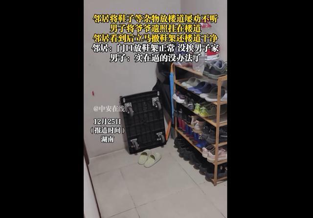 12月25日(报道时间),湖南。一男子在楼道挂爷爷遗照“劝退”邻居乱放鞋架引发热议。